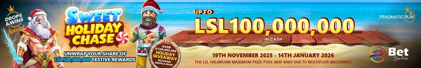 Sweet Holiday Chase, featuring a LSL100,000,000 prize pool. Prizes are awarded as bet multipliers, 10 free spins* or 5 free spins* in any game running from 19th November 2025 to 14th January 2026.